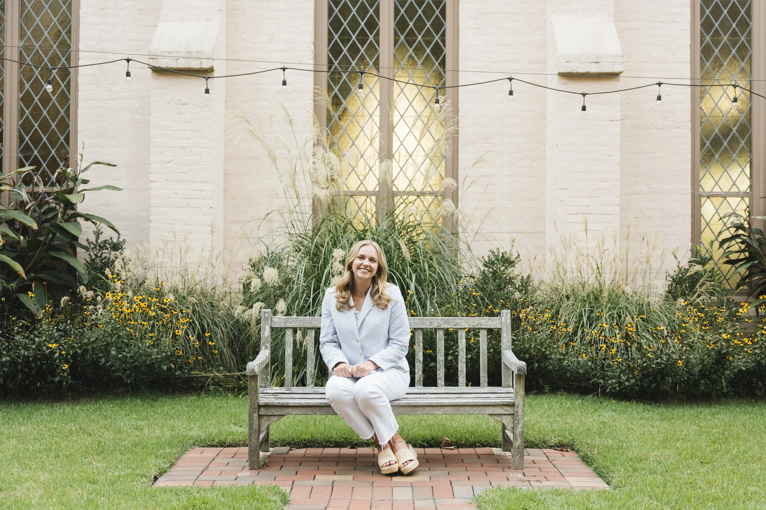 A young woman dressed in white, sitting on a wooden bench in a garden, smiling at the camera.